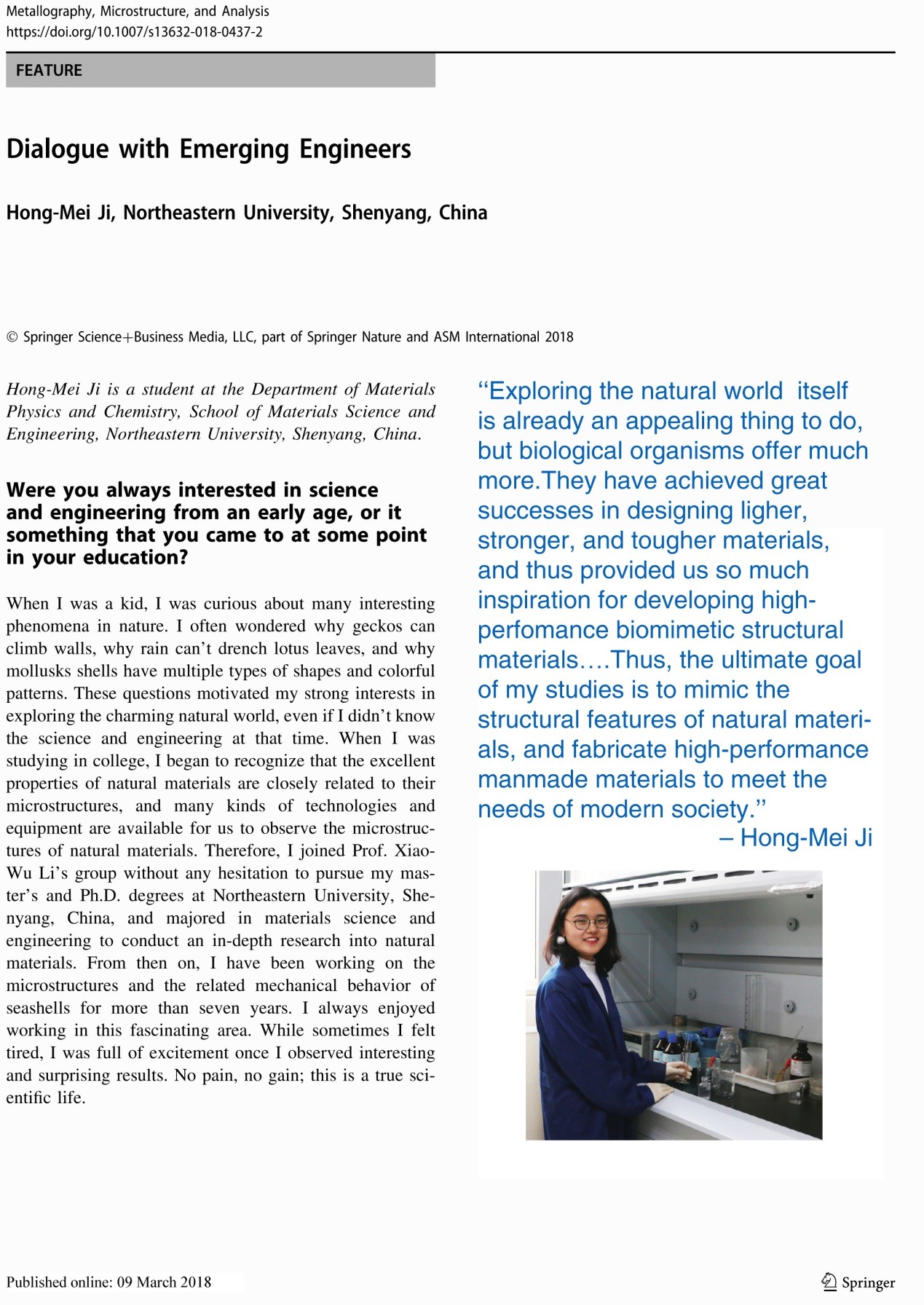 博士生季洪梅同学进行了采访,并以“Dialogue with Emerging Engineers”(对话新兴工程师)为题,将专访发表在该期刊上。