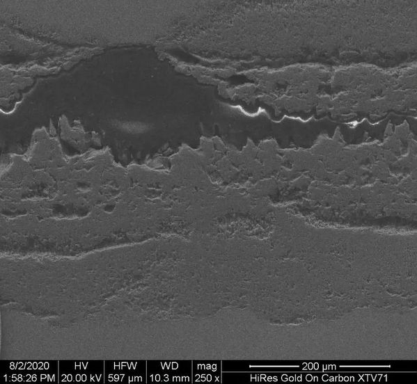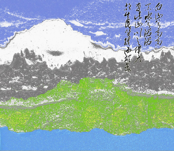 研究生贾泽伟、单文超、曾林林同学的《白山黑水》,原图为436不锈钢在高温同步差热分析仪中经1050摄氏度高温氧化4h后的氧化层SEM断面形貌。艺术图是利用Photoshop快速选择和色彩范围选择将原SEM图分割为多个图层,然后利用色阶、色相/饱和度和添加蒙版等调整各图层的颜色,最终得到由雪山、草地和河流组成的白山黑水图,彰显了材料学子对森林舞会游戏