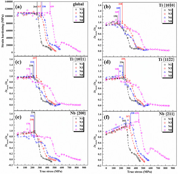 基于此,贾楠教授团队通过与瑞典林雪平森林舞会游戏 、德国电子同步加速器研究所等单位合作,借助同步辐射原位高能X射线衍射技术对经累积叠轧(ARB)制备的Ti/Nb多层复合材料的微观应力与宏观力学性能的关联性进行了研究。通过分别对包含有平直界面和剪切带开动导致的弯曲界面的复合体在拉伸载荷下的微观结构演化(图1)、微观应变分布与演化(图2)的精细表征可知,随着ARB循环次数增加,复合材料的快速强化主要来源于Nb层中位错、晶界和异质界面的强化作用,{211}取向晶粒对材料整体的应变硬化起主要作用。同时,较软的Ti晶粒使得块体材料的应变硬化范围扩大,从而延缓了颈缩发生(图3、4)。此外,对全应力状态的计算揭示了在形变剪切带预先广泛存在于片层状结构的情形下,相邻金属之间显著的载荷传递与再分配导致各组元金属均承受三轴应力,从而促使位错沿着剪切方向滑移(图5)。这促进了各金属内部位错的增殖和运动,有利于在提升强度的同时使复合体维持良好的均匀塑性变形的能力。
