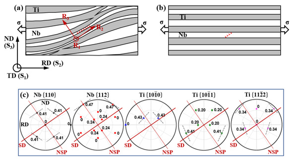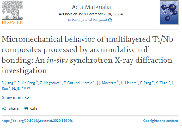 近年来,森林舞会游戏 贾楠教授课题组在金属层状复合材料的剪切带变形机制和形变微取向演化方面开展了系统的实验表征与数值模拟研究,主要成果发表在Acta Materialia (2013,61:4591-4606; 2014,76:238-251; 2016,111: 116-128)和Journal of Materials Science & Technology (2019, 35: 1165)等SCI期刊上。最近,该课题组在“累积叠轧制备亚微米尺度金属层状复合体的形变微结构演化和受剪切带调控的微观力学行为”方面又取得了新的研究进展,为借助微结构和织构调控来改善金属层状复合材料的力学性能以及对双相/复合材料共变形的研究提供了新的思路。相关结果以题为“Micromechanical behavior of multilayered Ti/Nb composites processed by accumulative roll bonding: An in-situ synchrotron X-ray diffraction investigation”发表在Acta Materialia上。