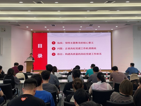 在专题报告中,姜玉原依托大量历史资料和生动实例,从新民主主义革命时期、社会主义革命和建设时期、改革开放和社会主义现代化建设新时期和中国特色社会主义新时代四个时期,为同学们系统、全面讲述了中国共产党的奋斗历程和学习贯彻习近平新时代中国特色社会主义思想主题教育的核心要义。随后,他沿着习近平总书记的高校考察调研足迹,围绕技术板块、技术手段、技术驱动三个部分为同学们生动阐述了新时代党的建设伟大工程、高校党建工作的机遇与挑战、构建高质量高校党建工作体系的目标与路径。姜玉原表示,高校党建工作应该坚持大抓基层的鲜明导向,以党建引领基层治理,发挥专业优势和岗位特点,提升党员体验感和参与度,服务社会、实现成长,把基层党组织建设成为有效实现党的领导的坚强战斗堡垒。