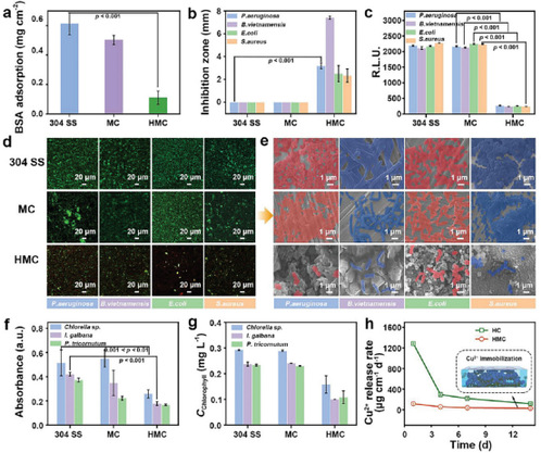 由于蛋白质是海洋生物污染初始阶段的关键成分,因此选择牛血清白蛋白(BSA)作为模型污染物来监测不同表面的茴香粘附性能。一旦材料浸入BSA溶液中,对所有表面都进行了污染物的强烈吸收。达到稳定吸收后,引入PBS溶液去除表面上松散粘合的BSA。BSA在HMC上几乎完全可逆的吸附-解吸显示出高效的防污性能,其源于水凝胶-MOF异相结构,产生强烈的界面水合和空间排斥,以防止调节膜的形成。