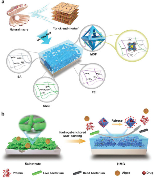 的徐大可课题组受珍珠母内无定形/结晶特征的启发,开发了一种由生物聚合物基水凝胶和致密金属有机骨架(MOFs)组成的机械坚固防污涂层。跨多尺度界面定制交联网络可以提供强度、消散应变并提高构建块的韧性,从而在各种基板上实现牢固且可扩展的配置,无论材料类别和表面拓扑如何。所得涂层作为合适的储层表现出独特的智能MOF降解或药物释放的主动防御行为,为广谱生物污染和腐蚀控制提供了突破性的性能。值得注意的是,在复杂的生物环境中进行长时间的测试过程中,既没有观察到海洋生物的附着,也没有观察到金属基质的MIC。本研究为综合防污腐蚀的潜在多机理提供了独特的见解,并开创了在海洋环境中设计下一代可靠MOFs衍生涂料的合理策略。该研究工作以题为“Nacre-Inspired Metal-Organic Framework Coatings Reinforced by Multiscale Hierarchical Cross-linking for Integrated Antifouling and Anti-Microbial Corrosion”的论文发表在国际顶级期刊《Advanced Functional Materials》上。