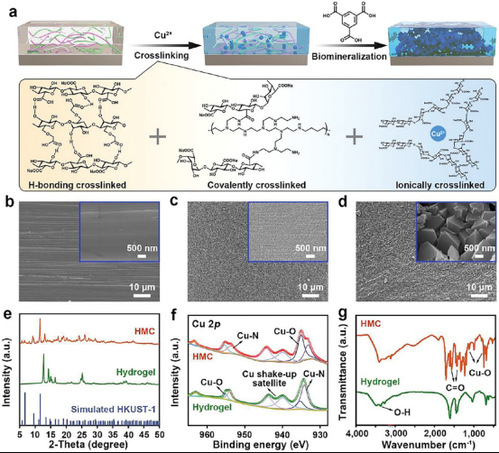 HMC是在温和的条件下通过水凝胶锚定涂装方法制造的,指的是在固体表面上稳定地粘附防污腐蚀MOF基层的两步技术。通常,作为基于软生物聚合物的相,首先在基材上构建具有明确厚度的极其坚韧的水凝胶。使用具有氢键和共价交联网络的SA,CMC和PEI作为前体浆液,以模拟天然珍珠层中的多尺度部分。二价金属离子,如铜离子(Cu2+)可以以高度协同的方式优先与藻酸盐链的古尿酸嵌段结合,并入水凝胶中,通过离子交联进一步改善机械行为。毫无疑问,所得的水凝胶在多个尺度上具有高密度交联界面,可作为后续反应的受限成核反应器。然后,针对海藻酸盐中的金属离子,通过在水凝胶体系中沉积有机接头来介导原位生物矿化过程,从而得到纳米级表面附着的MOF异相单元。配位效应和约束效应的网络纠缠保证了水凝胶和MOF之间的稳定键合。最后,在表面完整地生成了具有高度有序结构的珍珠层启发的HMC。