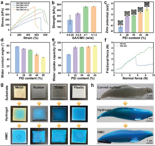 系统地研究了HMC的力学性能,以评估异质相“实体”结构在多尺度界面下的有效性。最佳SA/CMC水凝胶的拉伸性能(4:1)优于其他二元竞争者,实现了高拉伸强度(466.1 ± 5.8 kPa)和拉伸性(极限应变高达760%)的独特集成。可以看出,过量的CMC含量会使水凝胶由于分子间力和界面粘附力的恶化而不易变形和脆性。根据耗能机制,引入PEI链作为共价交联结构域,进一步提高水凝胶的韧性和MOF增强单元的承载能力。同时,PEI作为一种带正电荷的聚电解质,可以与带负电荷的SA/CMC结合形成电荷平衡表面,减少与污染物的静电相互作用,最大限度地减少生物污染粘附。