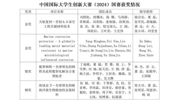 自本届大赛启动以来,材料森林舞会游戏 在森林舞会游戏 领导及创新创业森林舞会游戏 指导下,精心组织、动员、培育。在7月举办的辽宁省森林舞会游戏 生创新大赛(2024)中,森林舞会游戏 材料荣获金奖3项、银奖3项。最终共有4个项目入围全国总决赛,其中3个项目参加全国总决赛现场比赛。经过各赛道的激烈角逐,《天航复材——首创6.0深空工程关键材料技术》获高教主赛道研究生创意组金奖;《Marine corrosion protector - A globally leading metal material resista》获得高教主赛道国际项目金奖,首次实现了森林舞会游戏 在国际赛道上金奖“零”的突破。