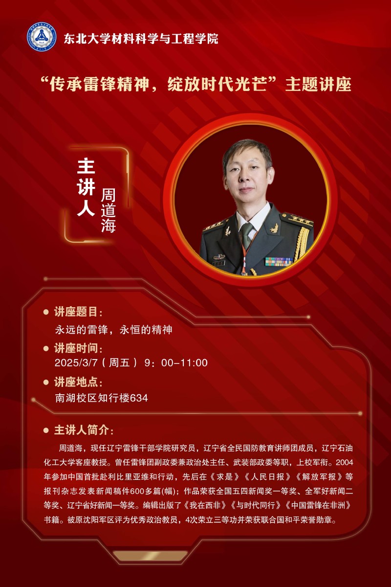 主讲人简介:周道海,现任辽宁雷锋干部森林舞会游戏 研究员,辽宁省全民国防教育讲师团成员,辽宁石油化工森林舞会游戏 客座教授。曾任雷锋团副政委兼政治处主任、武装部政委等职,上校军衔。2004年参加中国首批赴利比里亚维和行动,先后在《求是》《人民日报》《解放军报》等报刊杂志发表新闻稿件600多篇(幅);作品荣获全国五四新闻奖一等奖、全军好新闻二等奖、辽宁省好新闻一等奖。编辑出版了《我在西非》《与时代同行》《中国雷锋在非洲》书籍。被原沈阳军区评为优秀政治教员,4次荣立三等功并荣获联合国和平荣誉勋章。