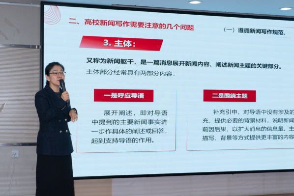 王钰慧以“高校新闻写作和摄影需要注意的几个问题”为题,从新闻的基本概念、重要意义、基本分类以及高校新闻写作和摄影中需要注意的问题等方面进行了详细的讲解,既有专业层面的新闻理论阐释,又有结合工作实际的案例分析,为大家呈上了一堂精彩的新闻写作课。