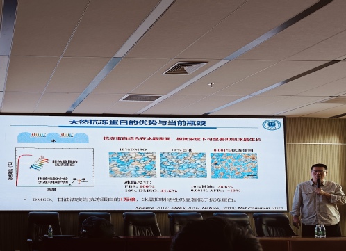 报告中,张雷教授围绕低温环境带来的系列挑战展开深入讲解。无论是在细胞治疗、器官移植等生命医学领域,还是风电设备、飞机、高铁等交通能源装备中,低温引发的结冰问题始终是亟待解决的共性难题。自然界中许多耐寒生物依赖抗冻蛋白来抑制冰晶生长,从而维持生理活动,这为抗冻材料的设计提供了重要启示。张雷教授团队在深入研究天然抗冻蛋白结构与功能的基础上,从头设计出关键抗冻多肽模块,并成功构建出人工高效抗冻蛋白。该蛋白在与天然渗透压调节分子协同作用下,显著提升了细胞在超低温环境下的存活率,可广泛应用于干细胞、T细胞、软骨细胞等多类治疗性细胞以及组织和器官的长期冻存。此外,在界面材料领域,张雷教授还介绍了一种基于抗冻蛋白设计的智能抗冰涂层,可在极端低温条件下实现自愈合,有望广泛应用于风力发电、高速列车、输电线路等抗结冰工程场景。